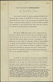 Julia Grace Wales was a Canadian-born Wisconsin university professor who was deeply troubled by reports of the war. She spent the autumn of 1914 considering possible methods for finding a peace solution.[2][3] The United States was neutral at the time, and President Woodrow Wilson asked his compatriots to remain "impartial in thought". In December, Wales prepared a plan. She proposed that the United States organize a conference (a "world thinking organ") composed of delegations from neutral countries, who would mediate between the warring powers and disseminate peace proposals, with the goal of eventually reaching a fair settlement. The conference was to last for as long as the war continued.[2][3][4] Two main principles were meant to guide the mediators: no nation could be humiliated by the peace, and there could be no compromises that could later lead to another war.[3] The plan was carefully revised many times.[2]
