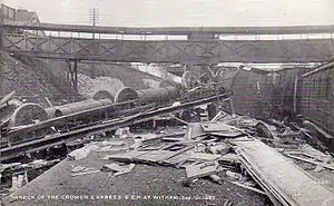 Witham railway station was the scene of a serious accident c. 09:27 AM on 1 September 1905. The London Liverpool Street-to-Cromer 14-coach express derailed whilst travelling at speed through the station. Ten passengers and a luggage porter were killed when several of the carriages somersaulted on to the platforms causing considerable damage to the rolling stock and the station. Seventy-one passengers were seriously injured.[7][8] It remains to this day the worst single loss of life in a railway accident in Essex.