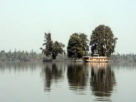 "Within You Without You" is the first of Harrison's many songs to include Hindu spiritual concepts in his lyrics.[16][17] Having incorporated elements of Eastern philosophy in "Love You To",[18] Harrison became fascinated by ancient Hindu teachings[19][20] after he and his wife, Pattie Boyd, visited Shankar in India in September–October 1966.[21][22] Intent on mastering the sitar, Harrison first joined other students of Shankar's in Bombay,[23][24] until local fans and the press learned of his arrival.[25][nb 1] Harrison, Boyd, Shankar and the latter's partner, Kamala Chakravarty, then relocated to a houseboat on Dal Lake[30] in Srinagar, Kashmir.[27][31] There, Harrison received personal tuition from Shankar while absorbing religious texts such as Paramahansa Yogananda's Autobiography of a Yogi and Swami Vivekananda's Raja Yoga.[32][33][nb 2] This period coincided with his introduction to meditation[9] and, during their visit to Vrindavan, he witnessed communal chanting for the first time.[37]