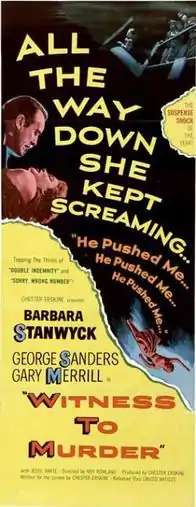 Witness to Murder is a 1954 American film noir crime drama directed by Roy Rowland and starring Barbara Stanwyck, George Sanders, and Gary Merrill. While the film received moderately positive reviews, it ended up as an also-ran to Alfred Hitchcock's somewhat similar Rear Window, which opened less than a month later. The latter picture was a box-office hit.[1]