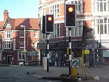 England's first automatic traffic lights could be seen in Princes Square in 1927.[40] The modern traffic lights at this location have the traditional striped poles to commemorate this fact. Princes Square was also the location of the United Kingdom's first pedestrian safety barriers, which were erected in 1934.[41] On 2 November 1927, the A4123 New Road was opened by the then-Prince of Wales (later Edward VIII)[42] linking the city with Birmingham. The New Road was designed as an unemployment relief project[43] and was the United Kingdom's first purpose-built intercity highway of the twentieth century.[44]