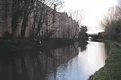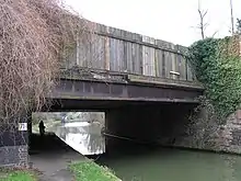 The original bridge, Bridge no. 171C, across the Grand Union canal was built in 1834-5 (chief engineer, Robert Stephenson) and is a grade II* listed building.[8] The bridge is composed of numerous cast iron girders, many made by the Butterley Company Iron works. It is a rare survival since most similar bridges were removed at the end of the Victorian era. The more imposing Wolverton viaduct to the north of the old station yard is one of the most impressive viaducts on the line, and was built in 1838 across the River Ouse valley. There were many problems encountered during construction, especially landslips on the adjacent embankment. They can still be seen just south of the viaduct and were portrayed by John Cooke Bourne in his description of the railway published just after it had opened..