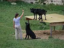 Though wolves are trainable, they lack the same degree of tractability seen in dogs. They are generally not as responsive as dogs to coercive techniques involving fear, aversion to stimuli, and force. Generally, far more work is required to obtain the same degree of reliability seen in most dogs. Even then, once a certain behavior has been repeated several times, wolves may get bored and ignore subsequent commands. Wolves are most responsive toward positive conditioning and rewards,[8] though simple praise is not sufficient as in most dogs.[9] Unlike dogs, wolves tend to respond more to hand signals than voice.[9] Although they are more difficult to control than dogs, they can be easier to teach if the motivation exists.[8]