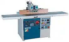 A wood shaper, usually just shaper in North America or spindle moulder in the UK and Europe, is a stationary woodworking machine in which a vertically oriented spindle drives cutter heads to mill profiles on wood stock. The wood being fed into a moulder is commonly referred to as either stock or blanks. The spindle may be raised and lowered relative to the shaper's table, and rotates between 3,000 and 10,000 rpm, with stock running along a vertical fence.