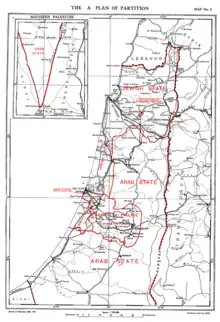 Plan C was preferred by the commission. This plan was a modification of the partition, which would form a satisfactory basis of settlement, if the United Kingdom was prepared to provide a sufficient assistance to enable the Arab State to balance its budget.[5] In this plan, the entire Galilee and a corridor from Jaffa to Jerusalem would remain under British mandate.