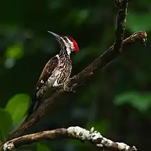 The name Picidae for the family was introduced by English zoologist William Elford Leach in a guide to the contents of the British Museum published in 1820.[48][49] The phylogeny has been updated according to new knowledge about convergence patterns and evolutionary history.[50][51] Most notably, the relationship of the Picinae genera has been largely clarified, and the Antillean piculet was found to be a surviving offshoot of protowoodpeckers. Genetic analysis supports the monophyly of the Picidae, which seem to have originated in the Old World, but the geographic origins of the Picinae is unclear. The Picumninae are returned as paraphyletic.[50] Morphological and behavioural characters, in addition to DNA evidence, highlights genus Hemicircus as the sister group of all remaining true woodpeckers, besides a sister-group relationship between the true woodpecker tribes Dendropicini and Malarpicini.[52]