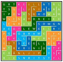 Sometimes secret messages are hidden in the word search.[1] In one variation, the secret message is created by all the words that are written backwards in the puzzle. In another variation, the secret message is created by the letters that are not used in any word within the puzzle. This variation is more common in more difficult puzzles where most letters are used. Kappa Publishing is well known for this. Their Magazines are called "The Magazine with the Last Message" or other saying that is related.