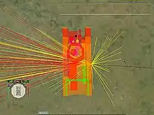 The ballistic model is also detailed, taking into account drag coefficient properties, muzzle velocity, and mass of each individual type of ammunition. The game engine considers the physical details of all rounds in flight and at point of impact, calculating the angle of impact and energy of the round, and the thickness and slope of the target vehicle's armor. Rounds which manage to penetrate may go on to cause damage to components or crew members in the path of penetration. High energy rounds that do not fully penetrate may still cause spall (high velocity metal fragments) within the vehicle, if close enough to penetration. Rounds that penetrate a vehicle will usually leave a visible hole on the outside, while rounds that don't penetrate may leave a scuff mark where the round bounced off. Small arms fire will also often leave bullet holes or scuff marks on buildings or vehicles.