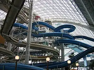 World Waterpark is a water park located within the West Edmonton Mall in Edmonton, Alberta, Canada. Opened to the public in 1986, it is the second largest indoor water park in North America, after American Dream's DreamWorks Water Park which opened on October 1, 2020.[7][8][9][10][11] It has a maximum capacity of 5,000 guests, an average air temperature of 31 °C (88 °F) and contains the world's largest indoor wave pool with a capacity of 12.5 million litres.[12][13]