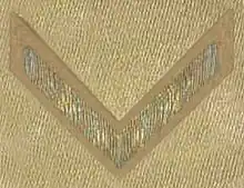A Wound Chevron was a United States military insignia authorized for wear on the service uniform between 1918 and 1932. The Wound Chevron was a gold metallic-thread chevron on an Olive Drab backing displayed on the lower right cuff of a US military uniform. It denoted wounds which were received in combat against an enemy force or hospitalization following a gassing.