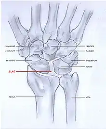 Scapholunate advanced collapse (SLAC) is a predictable pattern of wrist osteoarthritis that results from untreated long-standing scapholunate instability, which in turn is secondary to a rupture of the scapholunate ligament.[5] The main type of such misalignment is dorsal intercalated segment instability (DISI) which is where the lunate angulates to the posterior side of the hand.[3][6]