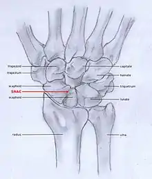 SLAC and SNAC are two patterns of wrist osteoarthritis, following predictable patterns depending on the type of underlying injury. SLAC is caused by scapholunate ligament rupture, and SNAC is caused by a scaphoid fracture which does not heal and because of that will develop in a non-union fracture. SLAC is more common than SNAC; 55% of the patients with wrist osteoarthritis has a SLAC wrist.[4]