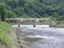 ![]() The remains of the viaduct carrying the railway over the River Wye in Monmouth; the Ross and Monmouth line's viaduct is beyond | |
