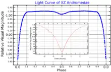 ![]() The visual band light curve of XZ Andromedae is shown. The main plot shows the light curve over a full cycle, and the inset plot shows the primary minimum on an expanded scale. Adapted from Yang (2013)[1] | |