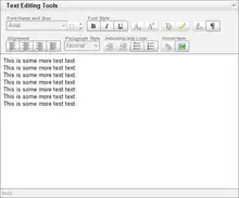 YUI Rich Text Editor is a project developed by Yahoo! as a part of the YUI Library for an online rich-text editor that replaces a standard HTML textarea. It allows for drag and drop inclusion and sizing of images, text coloring, realignment, fonts, italic and bold text. The YUI rich text editor uses a plug-in architecture and it is skinnable along with the rest of the YUI.[1]