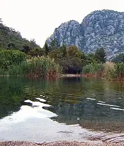 The location is 80 km southwest of Antalya, near the town of Çıralı. The area is located on a track popular with hikers and trekkers on the Lycian Way.