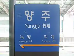 Yangju Station is a train station on Seoul Subway Line 1 and the Gyeongwon Line. The name comes from Yangju, the city where this station is located. Until December 2007, it was called Junae Station.[1]
