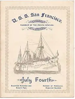 During the two years at sea then required of a naval cadet that had passed his academic studies before commissioning as an ensign, Stirling was first assigned to the protected cruiser USS San Francisco (C-5) that he and four other cadets joined in the Sandwich Islands, (as the Territory of Hawaii was also known) in July 1892. Seeing these exotic islands that he had heard about in his father's stories, despite the tropical setting Stirling was somewhat disappointed to find no "truly Hawaiian villages" and that "Hawaiian life even then had merged into Western civilization or Oriental."[20] Observing the miscegenation of whites with the indigenous Hawaiians during the few weeks his ship was at Hawaii, he later wrote in his memoirs, "I found them most wholesome companions, although I had the feeling that I must be careful not to fall in love. It seemed strange to see a dignified white official surrounded by children with skins as dark as a mulatto."[20] Stirling's nineteenth century ethnic and cultural beliefs aside, he noted the geopolitical undercurrents of the importance of Hawaii to the United States, Great Britain and Japan as each maintained a naval presence. "All three nations were watching each other to be sure no one would obtain advantage over another and become too powerful in Court circles. Hawaii was known to be an important strategical location with great commercial prospects. The United States would not have permitted any other nation to seize the Islands, yet at that time, the Administration in Washington, under President Cleveland, did not feel itself strong enough to take them for this country. Our method, therefore, was one of watchful waiting and maintaining friendly relations with the Hawaiian Queen (Liliuokalani) and her government."[21] Japan's long-standing ambitions in the Pacific were driving a naval buildup for the First Sino-Japanese War two years later and eventually for war with the U.S., as Stirling would predict in articles and lectures in the 1930s and as others such as Homer Lea, had foretold as early as the first decade of the twentieth century.[21]