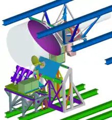 - M2 is the hyperbolic sub-reflector of the dual reflector Cassegrain system and has a diameter of 3.28 metres. It is made from a carbon fibre shell covered in a thin layer of aluminium foil. The requirement on the surface flatness is tighter than for the primary due to the scaling of the main beam size and comes in at 53 microns RMS. It has two nominal movement phase ; firstly a fine motion to correct for defocusing as a small defocus at the secondary is magnified 21 times at the Cassegrain focus and which can result in large coupling losses especially at high frequencies. Secondly a large axial displacement is also possible (1 metre) which allows the holographic receptor to be placed in the focus of the parabolic reflector.