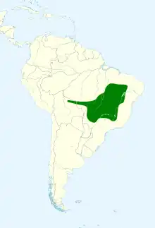 The majority of its range is in central and eastern Brazil, where found from Maranhão and Piauí to São Paulo and Mato Grosso do Sul.[1] It inhabits the cerrado on the plateau of Brazil,[8] as well as the dryer Caatinga scrubland. There are two records from Beni in northeastern Bolivia.[1] Despite occasionally being listed for Paraguay, evidence supporting its presence in this country is lacking.[1] Within its range it appears to be semi-nomadic. Much of its habitat is being converted to agricultural land and the populations are declining.[1]