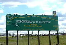 The Yellowhead Highway (French: Route Yellowhead) is a major interprovincial highway in Western Canada that runs from Winnipeg to Graham Island off the coast of British Columbia via Saskatoon and Edmonton. It stretches across the four western Canadian provinces of British Columbia, Alberta, Saskatchewan, and Manitoba and is part of the Trans-Canada Highway system and the larger National Highway System, but should not be confused with the more southerly, originally-designated Trans-Canada Highway. The highway was officially opened in 1970.[4] Beginning in 1990, the green and white Trans-Canada logo was used to designate the roadway.[3]