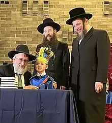 ![]() Reisman (seated) at a celebratory function with a student and his two teachers at Yeshiva Torah Vodaas c. 2022 | |