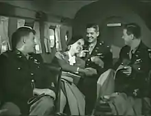 In a running gag, the three officers are expecting to meet "I. V. Hotchkiss," from the Treasury Department.[6] During a press conference at the airport, Bob slips away to find Mr. Hotchkiss who turns out to be Ivy (Lizabeth Scott),a beautiful young woman, whose name was misspelled in Bob's orders. Her boss was injured in a car accident on the way to the airport, so she took over. Bob is incredulous at the idea of an ingénue being the chaperone of three older men, and requests a "briefing room." Despite being miffed at his patronizing attitude, she complies. The airport manager warns that her charges have the appearance of being "wolves," but Ivy replies "But I don't happen to be Little Red Riding Hood."