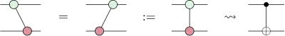 Two diagrams represent the same linear operator if they consist of the same generators connected in the same ways. In other words, whenever two ZX-diagrams can be transformed into one another by topological deformation, then they represent the same linear map. Thus, the controlled-NOT gate can be represented as follows: