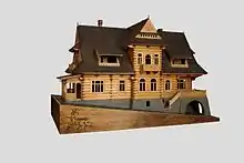 The Zakopane style also gained popularity beyond the Polish highlands.[3] In the Warsaw area, attempts were made to adapt the style to brick construction.[3] Examples include Czeslaw Domaniewski's design for a series of train stations and the design for a townhouse located at 30 Chmielna Street in the center of Warsaw.[3] In 1900, the young Kraków-based architect Franciszek Mączyński won an international architectural competition organized by the Paris-based magazine Moniteur des Architectes with a design of a villa in the Zakopane style.[3] There was also the Chata built for author Stefan Żeromski in Nałęczów, a series of villas in Wisła as well as in Konstancin and Anin and a brick tenement by Jan Starowicz dubbed "Beneath the Góral" in Łódź,[4] as well as the train station in Saldutiškis, Lithuania.[5]