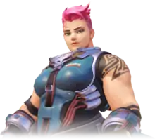 Aleksandra Zaryanova, or Zarya for short, is a Russian powerlifter and soldier. She was initially conceived for Overwatch by artist Arnold Tsang after watching a weightlifting competition. He recognized that the body shape of weightlifters was non-standard but would make for a great, tough female hero.[2] She was created in part to satisfy calls from fans to add more diverse body types after the initial set of heroes were revealed for the game.[3] Her design was inspired by one of Blizzard's 3D artists, Tamara Bakhlycheva, particularly her pink pixie cut hairstyle.[4] Overwatch director Jeff Kaplan noted her as an example of how character designs challenge the stereotypes of their character types.[5] She is armed with a Particle Cannon that can either emit a continuous beam of energy or launch an energy projectile in an arc. She is also able to project a personal Particle Barrier onto herself or onto one of her teammates (Projected Barrier), and soaking up damage with these barriers raises the power of her own attacks proportionally. Zarya's ultimate ability, Graviton Surge, forms a gravity well that pulls enemies in and damages them, leaving them open to other attacks. Zarya is voiced by Dolya Gavanski.[6]