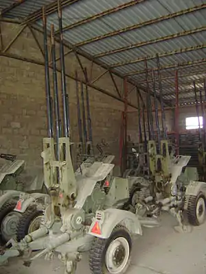 The Zastava M55 A2 was employed extensively by the People's Armed Forces of Liberation of Angola (FAPLA) during the Angolan Civil War (1975–2002) and the later stages of the South African Border War (1966–1990), with a number of them being captured by the South African Defence Force during their military operations launched against SWAPO/PLAN guerrilla bases at southern Angola in the 1980s.[10] Some of the captured guns were stripped from the triple mounts and re-mounted on the Casspir APCs employed by the Koevoet on their counter-insurgency operations in Angola and South West Africa[11] whilst others were handed over to the Armed Forces of Liberation of Angola, the armed wing of UNITA.