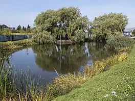On-site of the pond following plant species were detected: Phragmites, Schoenoplectus lacustris, Typha latifolia, Ceratophyllum and Elodea canadensis.[1] In the vicinity of the reservoir there are willows. In a study in 2004 on the territory of the pond and its surroundings mallards were detected.[5]