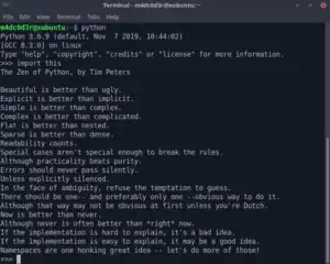 Peters's Zen of Python was included as entry number 20 in the language's official Python Enhancement Proposals and was released into the public domain.[3] It is also included as an Easter egg in the Python interpreter, where it can be displayed by entering import this.[1][3]