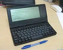 Manufactured around 1991–1992 and selling for $595, the Zeos Pocket PC was a palmtop which ran MS-DOS 5.0 and was broadly similar in form and function to the Poqet PC. The device was also available as Tidalwave PS-1000, Vobis Highscreen Handy Organizer, and Peacock Palmtop PC in other countries.[4] It was bundled with Microsoft Works and RacePen. Its dimensions were 4.5" × 9.7" × 1.0" and it weighed approximately 1.3 lb (0.59 kg). The 640x200 monochrome LCD screen was about 2.75" × 7" and was not backlit. The keyboard was 9" wide (compared to 11" for a standard keyboard), making typing slightly tedious for many people. The unit featured two PCMCIA card slots, as well as a serial and a parallel port located on the rear which used proprietary mini-connectors and custom cables, which were included with the unit. The unit powered on instantly using two standard AA batteries and one lithium backup battery. It was manufactured in Taiwan and sold by mail-order.