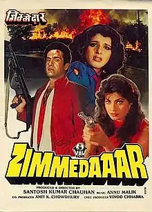 Zimmedaaar is a 1990 Indian Bollywood film directed and produced by Santosh Kumar Chauhan. It stars Rajiv Kapoor, Anita Raj and Kimi Katkar in pivotal roles. After this movie, Rajiv Kapoor did not feature in any films for over thirty years. This was also his last film to be released when he was alive. His final film, Toolsidas Junior (2022) was released posthumously a year after Kapoor died in February 2021.[1][2]