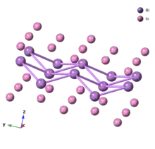 This type of solid is named after German chemist Eduard Zintl who investigated them in the 1930s. The term "Zintl Phases" was first used by Laves in 1941.[2] In his early studies, Zintl noted that there was an atomic volume contraction upon the formation of these products and realized that this could indicate cation formation. He suggested that the structures of these phases were ionic, with complete electron transfer from the more electropositive metal to the more electronegative main group element.[1] The structure of the anion within the phase is then considered on the basis of the resulting electronic state. These ideas are further developed in the Zintl-Klemm-Busmann concept, where the polyanion structure should be similar to that of the isovalent element. Further, the anionic sublattice can be isolated as polyanions (Zintl ions) in solution and are the basis of a rich subfield of main group inorganic chemistry.
