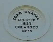 The Biblical city of Zoar, now rendered Zoara, gives its name to the chapel and to others in neighbouring West Sussex: at Handcross (founded 1775; still Strict Baptist)[23] and Wisborough Green (founded 1753; now Evangelical).[24] Former chapels of that name, neither of which survived the 19th century, were at Brighton (Windsor Street)[11] and Hastings in East Sussex.[25] There are several others elsewhere in England.[18]