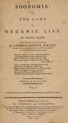 Zoonomia; or the Laws of Organic Life (1794-96) is a two-volume medical work by Erasmus Darwin dealing with pathology, anatomy, psychology, and the functioning of the body. Its primary framework is one of associationist psychophysiology.[1] The book is now best remembered for its early ideas relating to the theory of evolution, specifically forms of developmentalism similar to Lamarckism.[1][2] However, despite Erasmus Darwin's familial connection as grandfather to Charles Darwin, the proto-evolutionary ideas in Zoonomia did not have a lasting influence.[3][4]