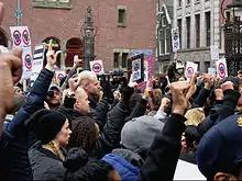 In November 2017, a group of anti-Piet demonstrators were prevented from attending a demonstration during a nationally televised celebration in the town of Dokkum after their vehicles were blocked on the A7 motorway by pro-Piet demonstrators, 34 of whom were later charged and found guilty of obstructing traffic.[35] During intocht celebrations throughout November 2018, violent incidents took place in the cities and towns of Nijmegen, The Hague, Leeuwarden, Den Helder, Rotterdam, and elsewhere. In Eindhoven, anti-Piet demonstrators were surrounded by an estimated group of 250 people described as "football hooligans" who attacked them with eggs and shouted racist insults. A similar protest in Tilburg led to the arrest of 44 pro-Piet demonstrators.[36]