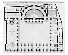 Gondoin wrote about the building that it "a monument of the beneficence of the King...which should have the character of magnificence relative to its function; a school whose fame attracts a great concourse of Pupils from all nations should appear open and easy of access. The absolute necessity of columns to fulfill these two objects, is alone sufficient to protect me from the reproach of having multiplied them unduly."[1]: 139–140 Ecole de Chirurgie changed the hôtel typology by building in the style for a public building versus a private house. Three wings surround a court acting as circulation for the entire building. Situated on an irregular plot, the Ecole is able to appear symmetrical.[2] Gondoin placed a screen of Ionic columns along the facades of both the walls facing the court and the street. A plain frieze rests directly upon the column capitals. Above the main entry arch, lying between the entablature and the upper cornice on the street façade is an Ionic relief panel, designed by Pierre-François Berruer. The relief panel depicts the muse of architecture giving a scroll of the building plan to the god of medicine.[1]: 140 The hemispherical anatomy theatre is at the rear. It is signified by the exterior by a Corinthian portico featuring freestanding columns. As a purely symbolic temple front, entrance occurs from the sides. Modeled after the Pantheon, it is lit by an oculus. A coffered ceiling drapes over the main stage and seating for 1200 spectators including the public, not just students. The people of the time saw surgery as a progressive movement and wanted to be a part of it. A semicircular lunette above the main doorway shows portraits of famous predecessors including Le Martinière along with paintings showing the King encouraging their progress and the gods engaged in transmitting the principles of anatomy.[1]: 141