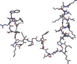 There are multiple forms of β-endorphins with the full sequence of Tyr-Gly-Gly-Phe-Met-Thr-Ser-Glu-Lys-Ser-Gln-Thr-Pro-Leu-Val-Thr-Leu-Phe-Lys-Asn-Ala-Ile-Ile-Lys-Asn-Ala-Tyr-Lys-Lys-Gly-Glu (31 amino acids) denoted as β-endorphin(1-31) and variants truncated to the first 26 and 27 amino acids as β-endorphin(1-26) and β-endorphin(1-27).[1][3][4] The first 16 amino acids are identical to α-endorphin. β-Endorphin is considered to be a part of the endogenous opioid and endorphin classes of neuropeptides;[1] all of the established endogenous opioid peptides contain the same N-terminal amino acid sequence, Tyr-Gly-Gly-Phe, followed by either -Met or -Leu.[1]