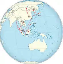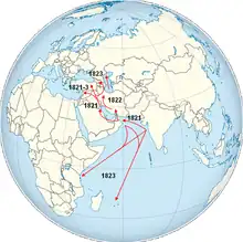 The spread of the first cholera pandemic was closely linked to warfare and trade.[4] According to economic history professor Donato Gómez-Diaz, "[advances] in commercial exchange and navigation contributed to cholera’s dispersion."[5] Navy and merchant ships carried people with the disease to the shores of the Indian Ocean, from Africa to Indonesia, and north to China and Japan.[9] During the Ottoman-Persian War of 1821–1823, cholera would affect both armies in what is modern-day Armenia.[4] Hindu pilgrims spread cholera within the subcontinent, as had happened many times previously, and British troops carried it overland to Nepal and Afghanistan. In 1821, British troops spread cholera to Oman after becoming infected with it in India.[4]