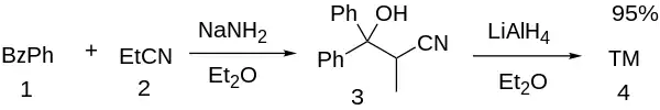 In a variation of the nitrile-Aldol reaction (also demonstrated for venlafaxine), combination of benzophenone (1) and propionitrile (2), in the presence of sodamide base and ethyl ether solvent, leads to 3-hydroxy-2-methyl-3,3-diphenylpropanenitrile [6275-86-1] (3). The reduction of the intermediate nitrile group with lithium aluminium hydride completed the synthesis of U-23,807A (4).