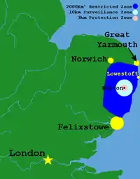 A 3 km protection zone, 10 km surveillance zone and a restricted zone encompassing 2000 km2 were set up.[14] Another 159,000 turkeys were slaughtered with the cull being completed on the evening of 5 February. Also on 5 February there was criticism that nearby farmers had not been advised as to the action to be taken.[15] Around 320 workers at the plant were given anti-viral drugs. Although a vet from the site was admitted into hospital, suffering from a 'mild respiratory illness' during the evening of 6 February, it was found not to be bird flu.[16] The plant was thoroughly disinfected, with cleaning complete on 12 February, and permission being given for production to resume.[17][18]