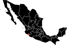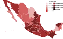 The first infected was registered in San Diego, California, on April 2, 2009, but it was misclassified as an H2N3 case.[15] It was not until April 13, with the first death in Oaxaca,[16] that further research was carried out, officially detecting the new type of virus on April 16.[17] The pandemic outbreak was first detected in the Federal District, where surveillance began picking up a surge in cases of influenza-like illness starting on March 18.[18] The surge was assumed by authorities to be "late-season flu" (which usually coincides with a mild Influenzavirus B peak[19]) until April 21,[20][21] when a CDC alert concerning two isolated cases of a novel swine flu was reported in the media (see 2009 swine flu outbreak in the United States).[22] Both cases were in US counties on the Mexico – United States border, adjacent to one state in Mexico where the influenza surge had been detected. This was the missing link that connected the surge and the new strain, and established the high suspicion of an outbreak. One study estimated that by the end of April, at least 113,000 to 375,000 people in Mexico had been infected.[23] Then, in early May, influenza activity began to decline, likely due to the shutdown of most public places in response to the outbreak. However, H1N1 remains present in Mexico, and as of December, was classified by WHO as widespread.