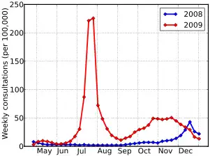 After a slow start, the virus spread rapidly in the UK in July 2009, with new cases peaking at 110,000 in the last week of that month, according to The Health Protection Agency's modelling estimate, but declining sharply in the first week of August 2009.[2][15] Cases fell progressively down to 3,000 in the first week of September 2009, then began to rise again.[2] The decline in cases during the summer had been predicted, but a large surge was expected in the autumn to coincide with the normal flu season.[15] Cases rose to 84,000 by the end of October, well below the summer's peak, and then declined during November.[2]