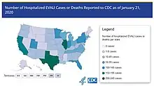 ![]() Map of reported hospitalized cases or deaths in the US and US territories.[2] | |