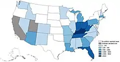 The 2019 United States hepatitis A outbreak was an occurrence of several declared outbreaks of the disease, hepatitis A, in locations in the United States including substantial instances in the states of Kentucky,[2] Mississippi, Florida, and the city of Philadelphia, Pennsylvania,[3] as well as an isolated food-related occurrence in New Jersey.[4] As of October 2019, over 26,000 cases and 268 deaths were reported, with the largest number occurring in Kentucky, with over 4,000 cases.[1][5]