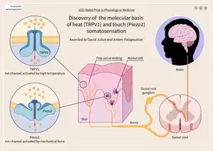 The 2021 Nobel Prize in Physiology or Medicine was jointly awarded to the American physiologist David Julius (b. 1955) and Armenian-American neuroscientist Ardem Patapoutian (b. 1967) "for the discovery of receptors for temperature and touch."[2] During the award ceremony on December 10, 2021, Nobel Assembly at Karolinska Institutet member Patrik Ernfors expressed: