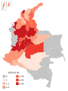 On July 8, the National Institute of Health confirmed a new case of the disease in Bogota from a person who had been in contact with an infected person from Italy when they had traveled to Europe.[28] On July 23, following the follow-up of several cases, health authorities began an extensive surveillance phase.[29] On the same day, the National Institute of Health confirmed that the number of cases in the country reached 10.[30] On July 25, the first case of a person who had been in Argentina was reported in the department of Cundinamarca, specifically in the municipality of Cajicá.[31] On July 29, the first case was detected in Pereira, capital of the department of Risaralda.[32] On July 30, the National Institute of Health confirmed the first case in the department of Valle del Cauca, specifically in the city of Cartago located in the north of the department.[33]